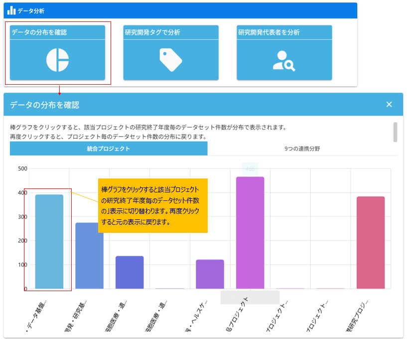 - 3)統合プロジェクト、9つの連携分野プロジェクト毎のデータセットの分布が表示されます。