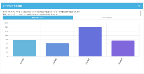 - 6)棒グラフをクリックすると、該当プロジェクトの研究終了年度毎のデータセット件数が 分布で表示されます。再度クリックすると、プロジェクト毎のデータセット件数の分布に戻ります。
