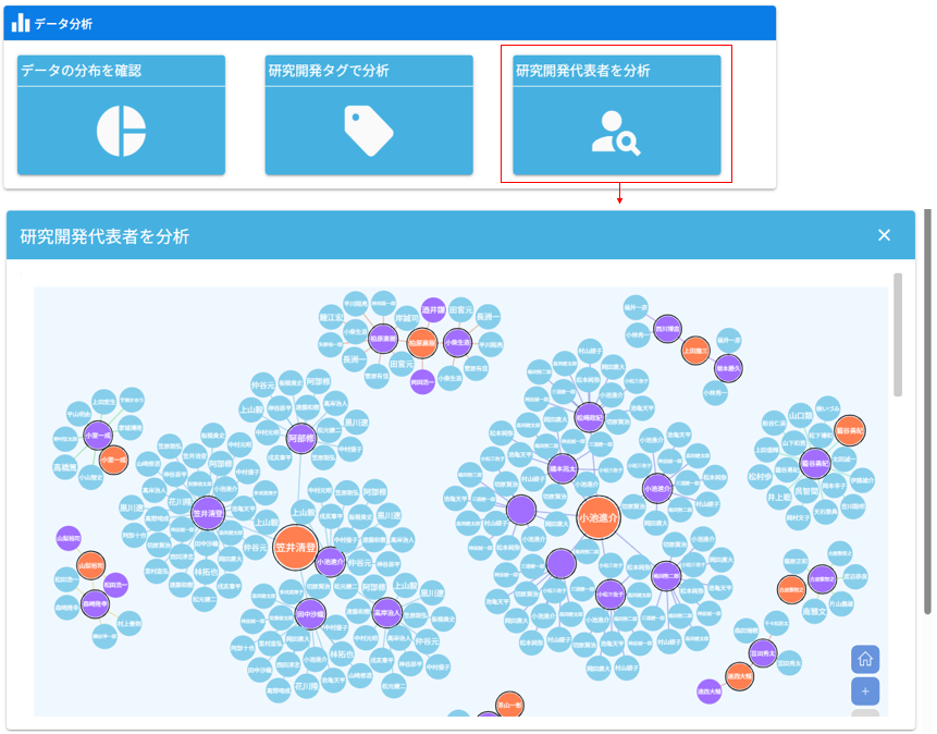 研究開発代表者、データ管理者及びデータ関連人材のつながりをネットワーク図で確認することができます。
