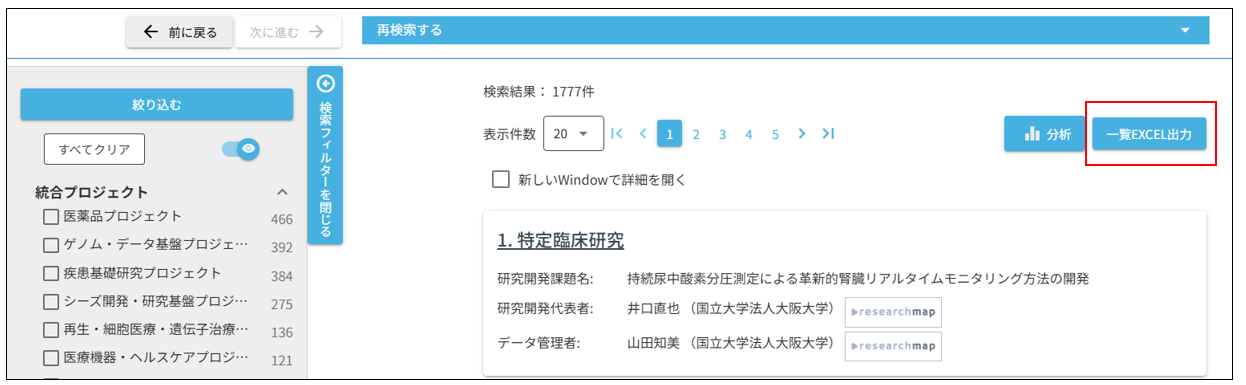 - 3)検索フィルター、再検索も一覧画面と同様に利用することができます。検索フィルター、再検索は、「3.検索結果を見る」の「②絞り込んで検索する」、 「③再検索する」をそれぞれご参照ください。