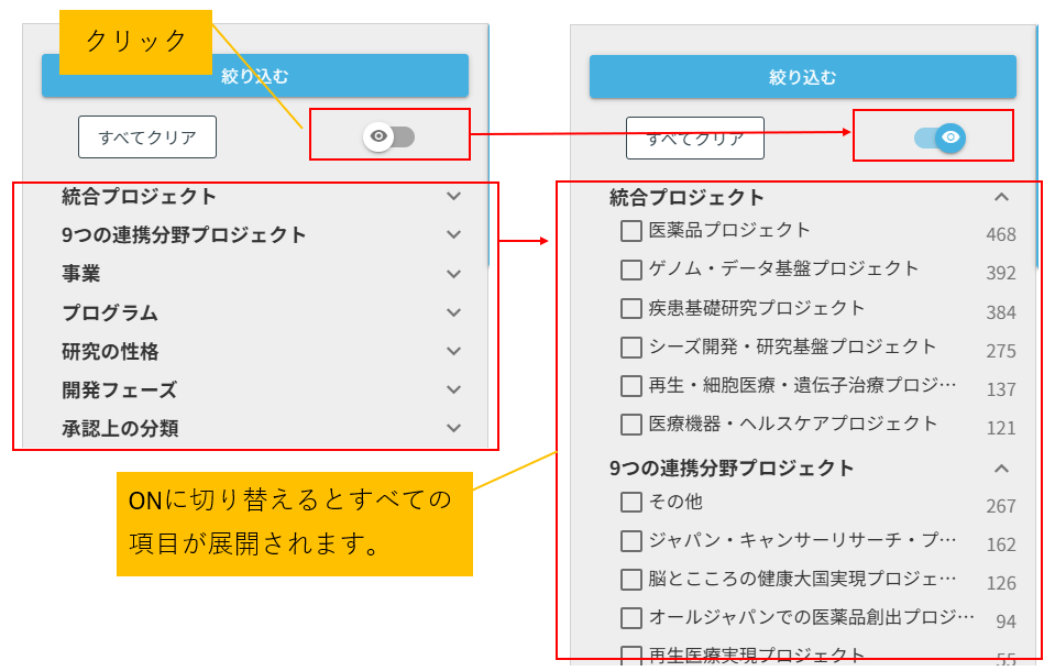 - 5)検索フィルター右上のチェックをONにすると、全ての項目が開いた状態となります。OFFにすると、全ての項目が閉じた状態となります。