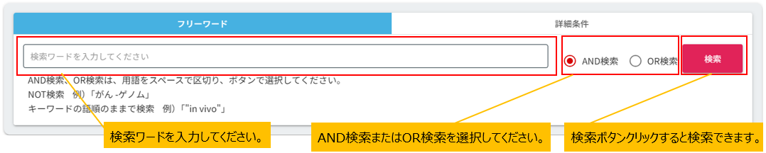 - 2)検索ボタン(下部)の左側に表示されている「AND検索」又は「OR検索」を選択することで、指定した各条件に対して、 AND検索(どちらも含む検索)又はOR検索(いずれか一つを含む検索)が行えます。