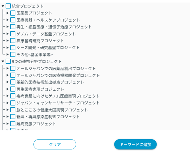 - 2)「プロジェクト・事業を参照」をクリックすると、以下のようなポップアップ画面が表示されますので、検索したい項目にチェックを入れて(複数指定可) 「キーワードに追加」をすると入力することができます。