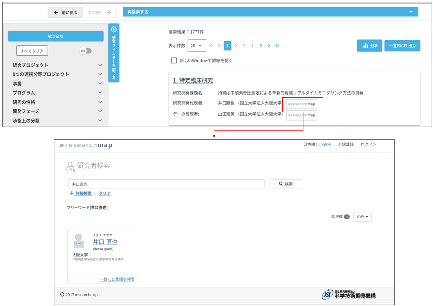 - 1)研究開発代表者の氏名や所属から検索することができます。
